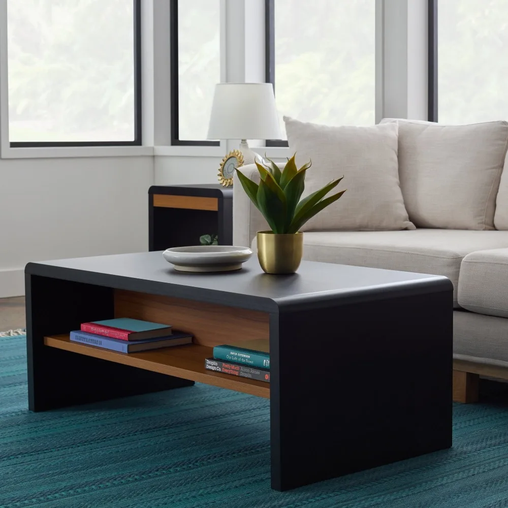 Embrace modern living with the Rounded Wood Coffee Table. Part of a full living room collection that includes a matching end table, TV stand, and entryway console table, this wood coffee table can stand alone or pair with any piece of the collection to create a cohesive living space. The hallmarks of this rectangle coffee table are smooth, rounded corners that create a sophisticated feel; a minimalistic, modern design; and simple but ample storage space for all your necessities. Made from particle board with a melamine paper finish, this coffee table is durably made to withstand the wear and tear of everyday life and maintain a modern and classy feel. Available in a solid Light Oak finish and a contrasting Black and Oak finish, this wood coffee table for living room ships right to your door and can be easily assembled with a partner to expertly complete your space.